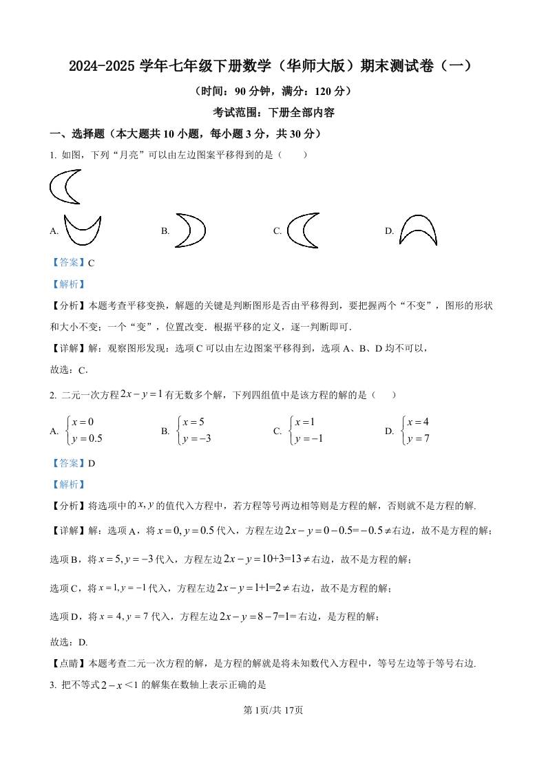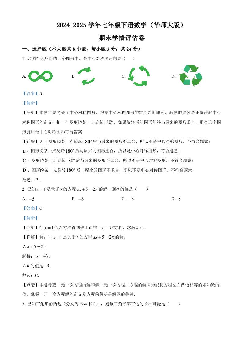 精品解析:期末测试卷(一)华东师大版七年级数学下册(解析版)