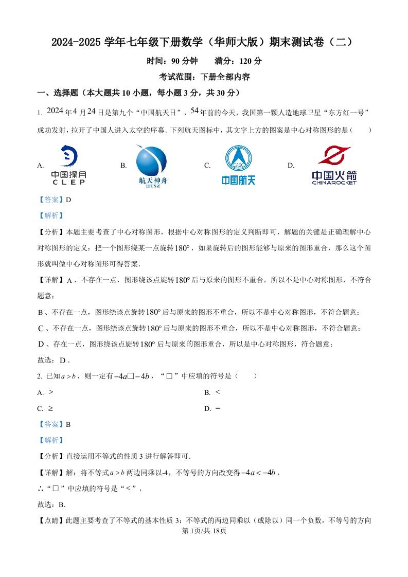 精品解析:期末测试卷(二)华东师大版七年级数学下册(解析版)