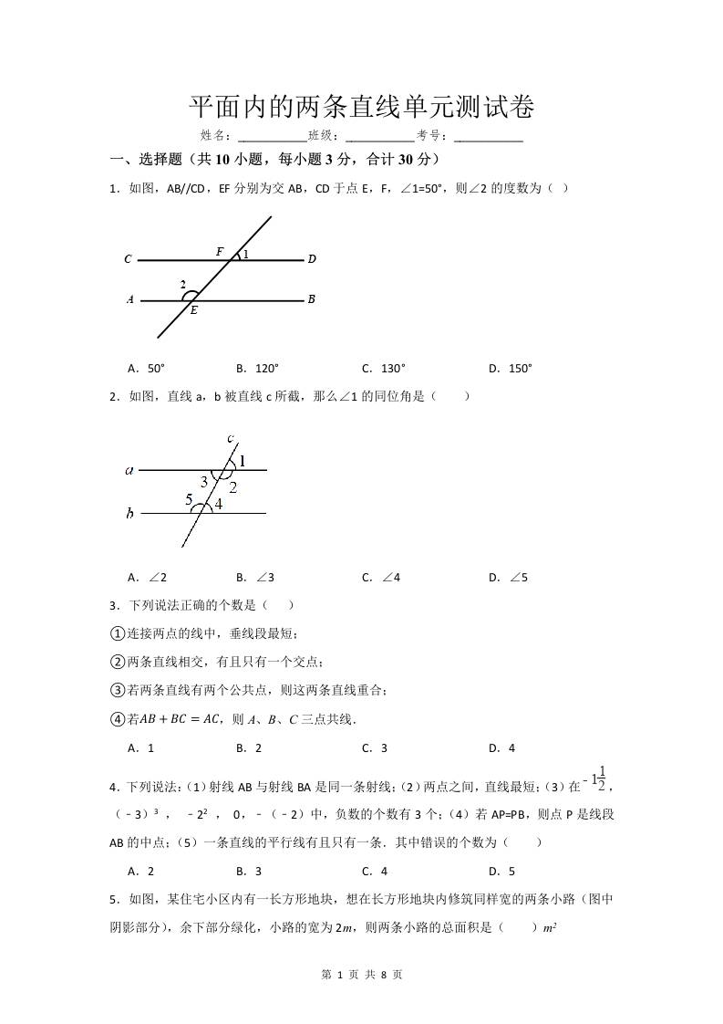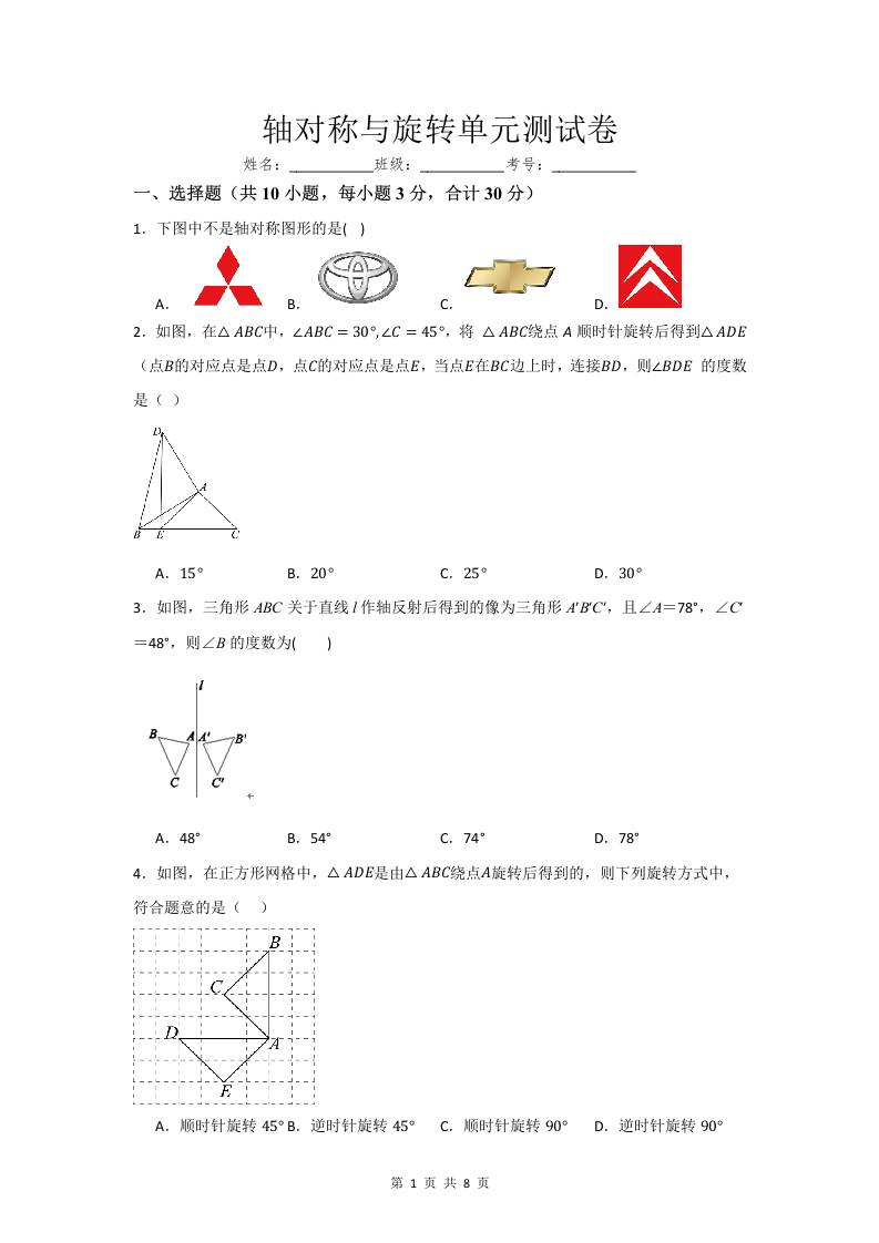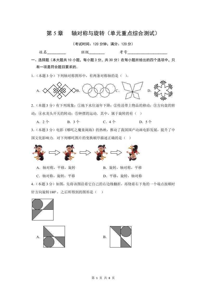 第5章轴对称与旋转(单元重点综合测试,湘教版)(原卷)