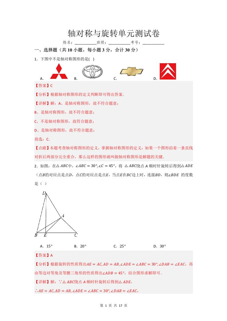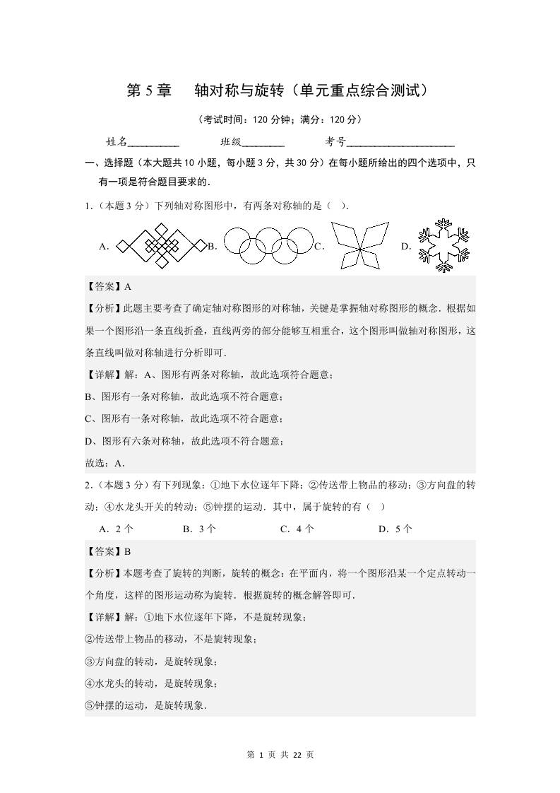第5章轴对称与旋转(单元重点综合测试,湘教版)(解析版)