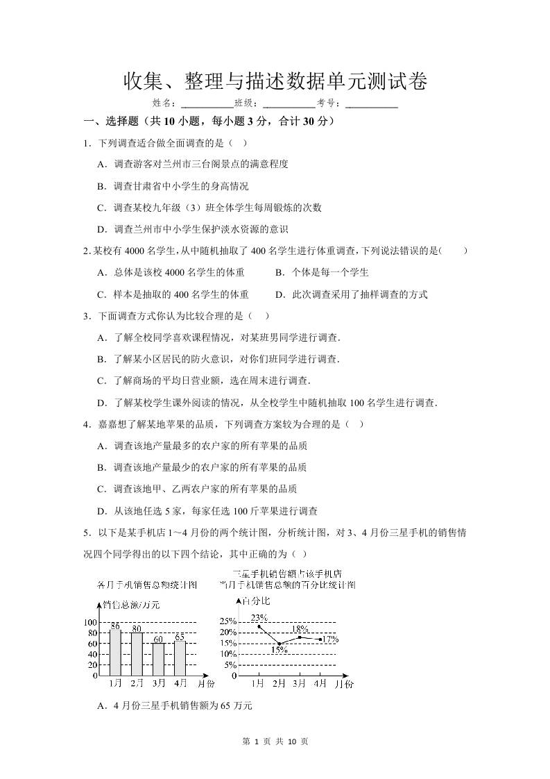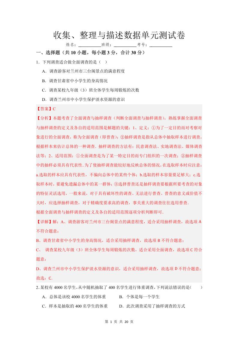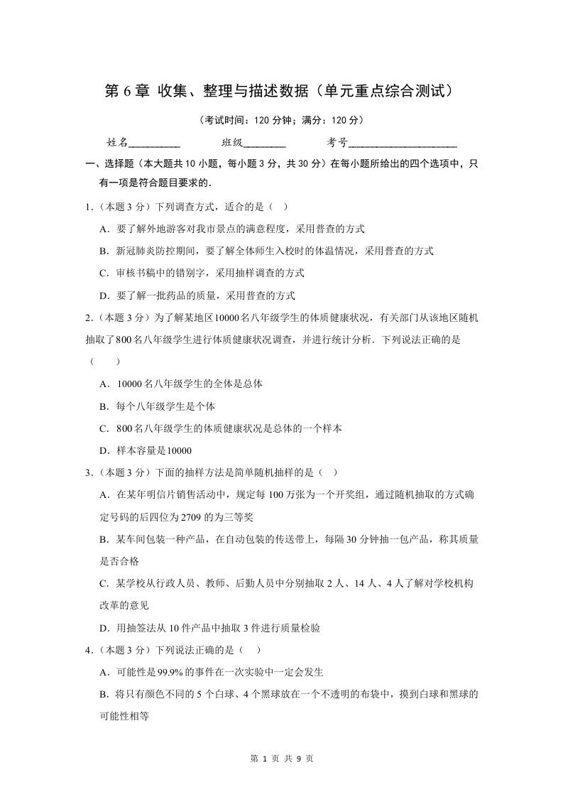 第6章收集、整理与描述数据单元测试卷(原卷版)
