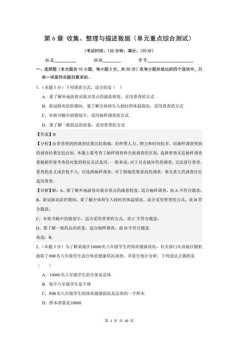 第6章收集、整理与描述数据单元测试卷(解析版)