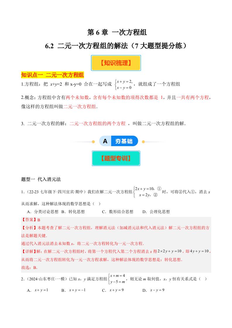 6.2 二元一次方程组的解法(7大题型提分练)(原卷版)