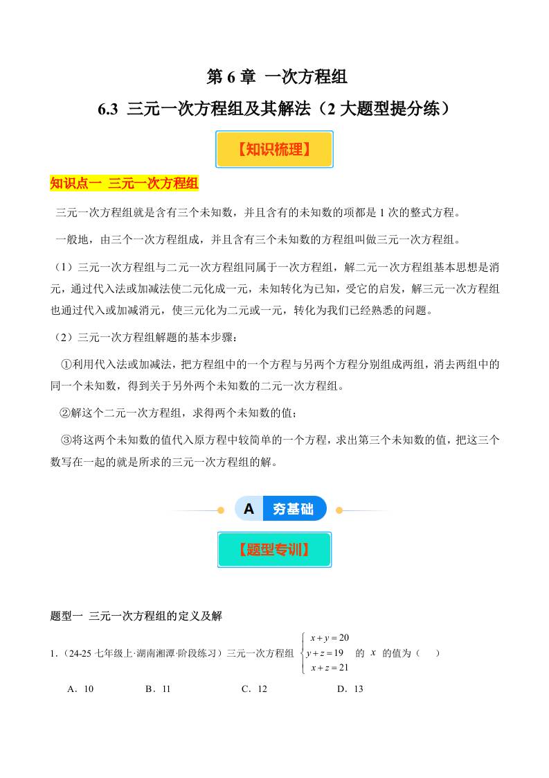 6.3 三元一次方程组及其解法(2大题型提分练)(原卷版)