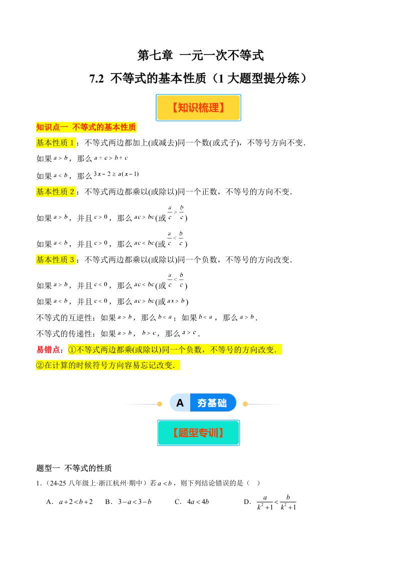 7.2 不等式的基本性质(1大题型提分练)(原卷版)