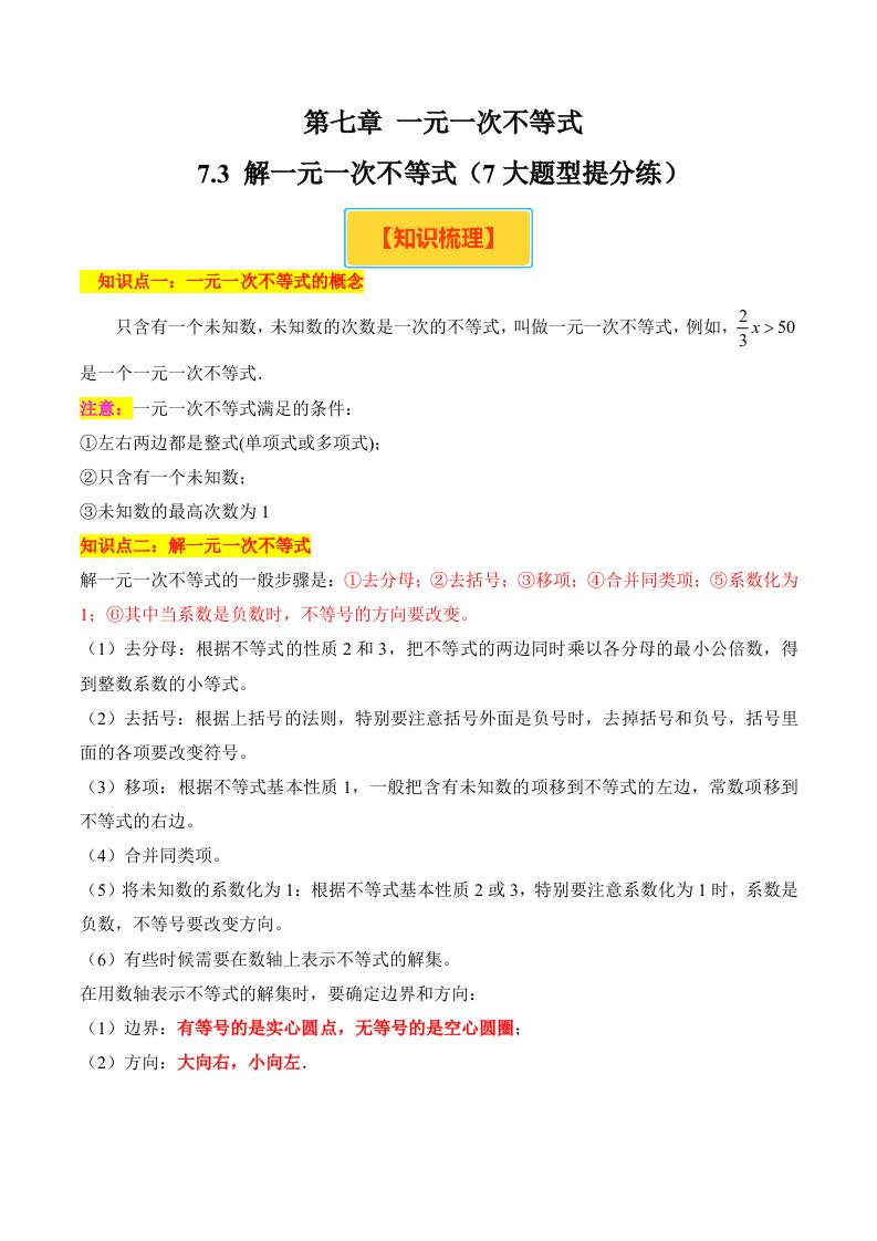 7.3 解一元一次不等式(7大题型提分练)(原卷版)