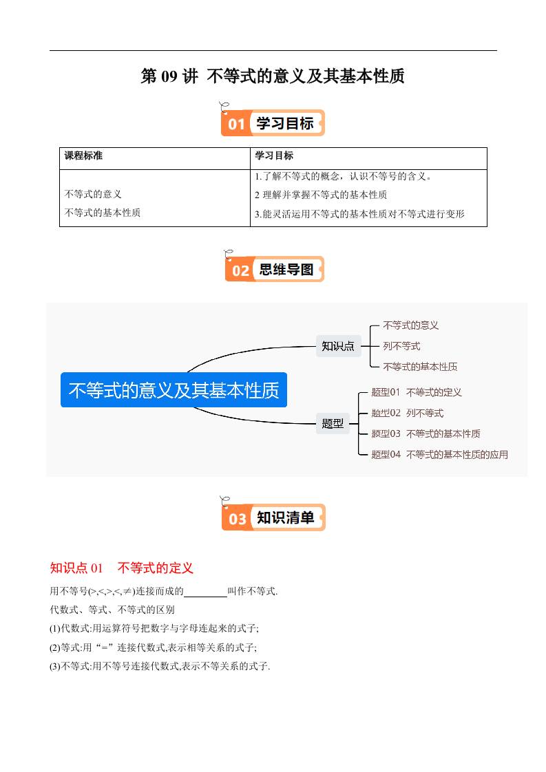 第09讲 不等式的意义及其基本性质(原卷版)