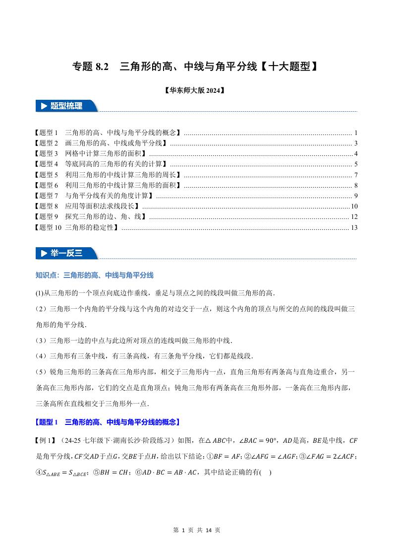 专题8.2 三角形的高、中线与角平分线【十大题型】(举一反三)(华东师大版2024)(原卷版)