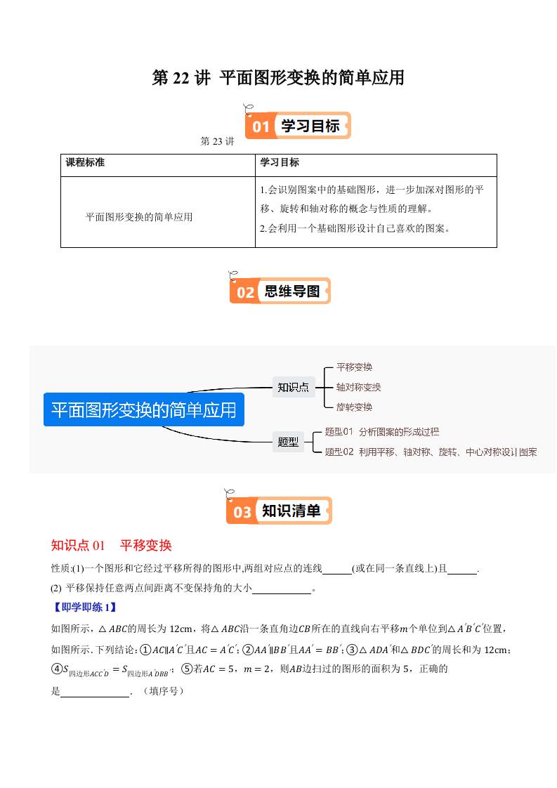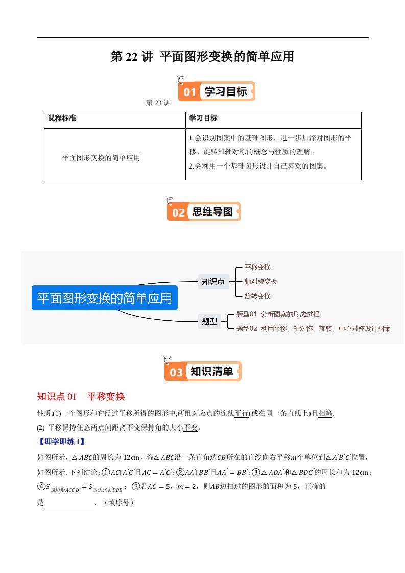 第22讲 平面图形变换的简单应用( 原卷版)