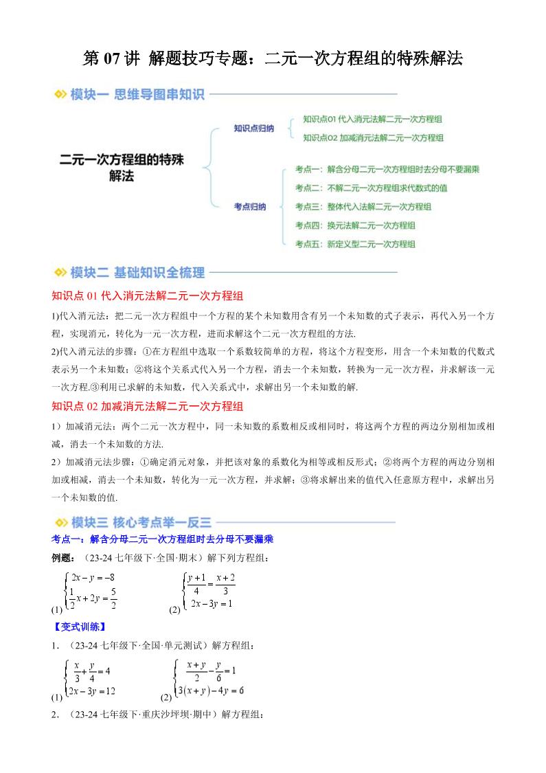 寒假预习第07讲 解题技巧专题:二元一次方程组的特殊解法(2个知识点 5大考点 过关检测)(原卷版)