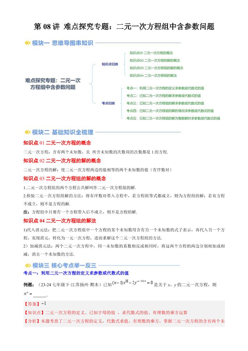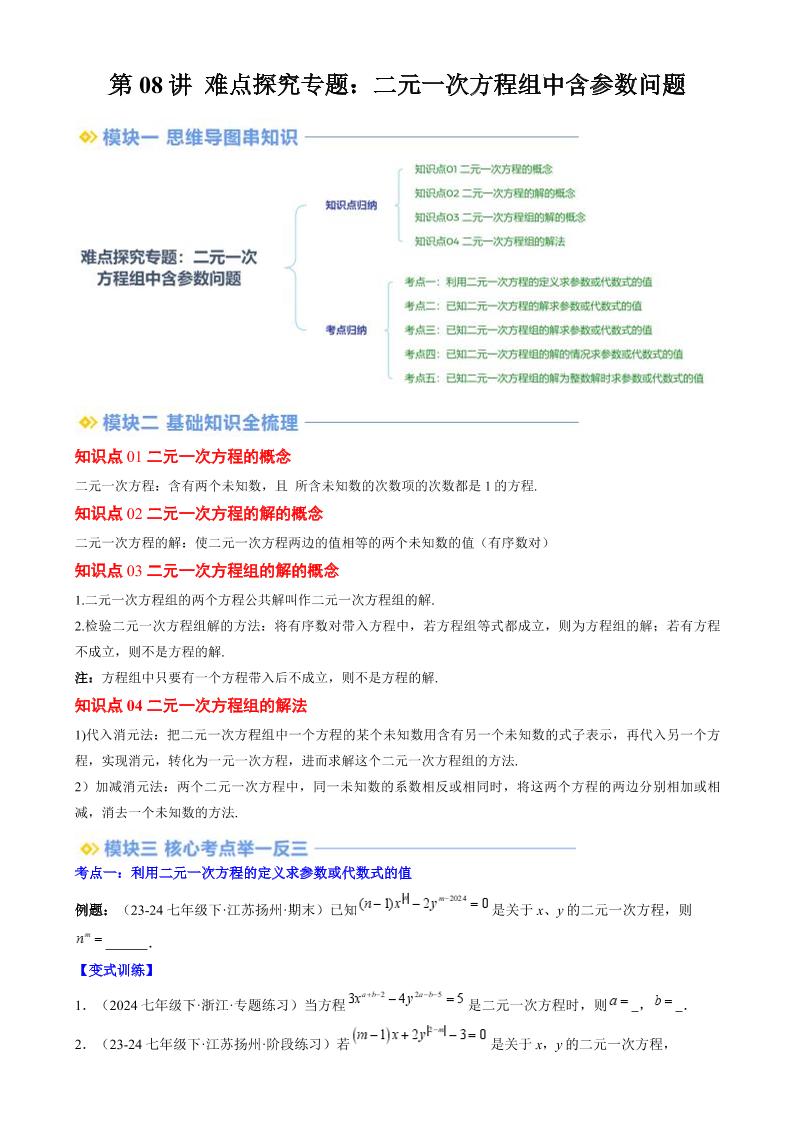 寒假预习第08讲 难点探究专题:二元一次方程组中含参数问题(4个知识点 5大考点 过关检测)(原卷版)