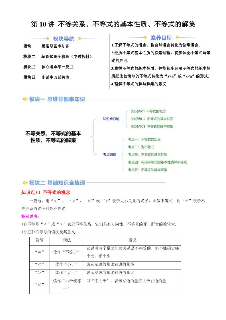 寒假预习第10讲 不等关系、不等式的基本性质、不等式的解集(3个知识点 5大考点 过关检测)(解析版)