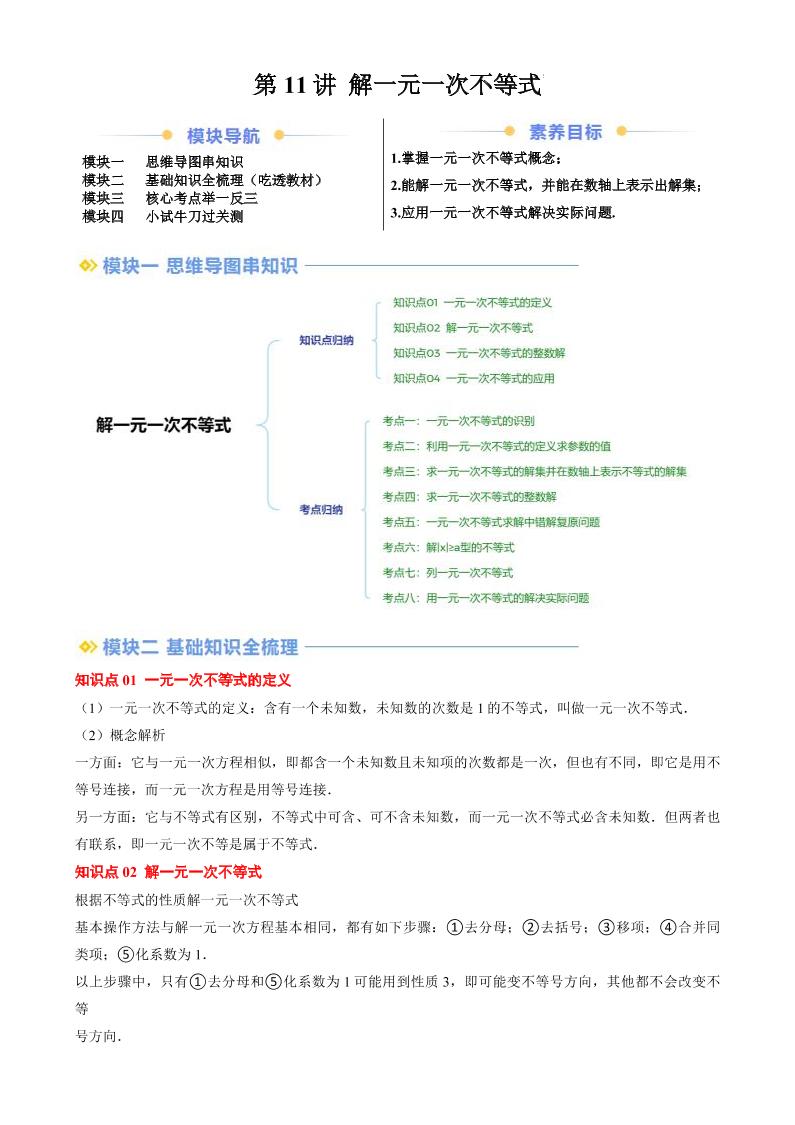 寒假预习第11讲 解一元一次不等式(4个知识点 8大考点 过关检测)(解析版)