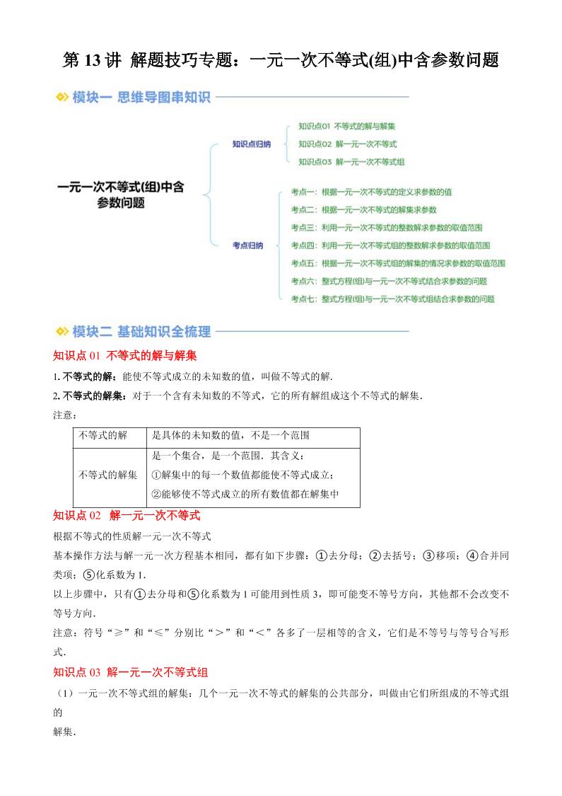 寒假预习第13讲 解题技巧专题:一元一次不等式(组)中含参数问题(3个知识点 7大考点 过关检测)(解析版)