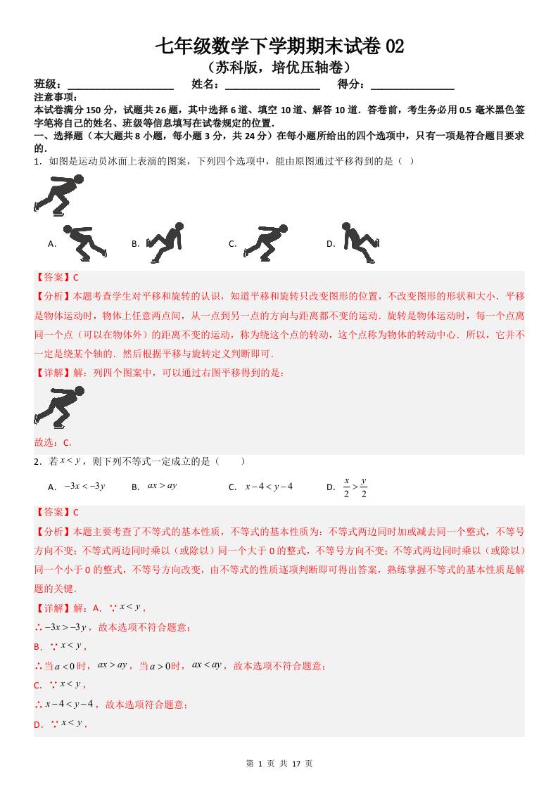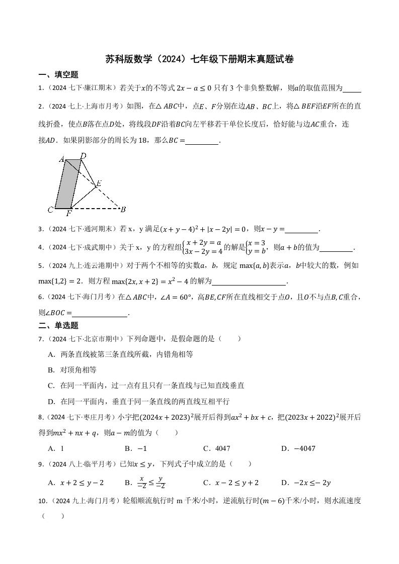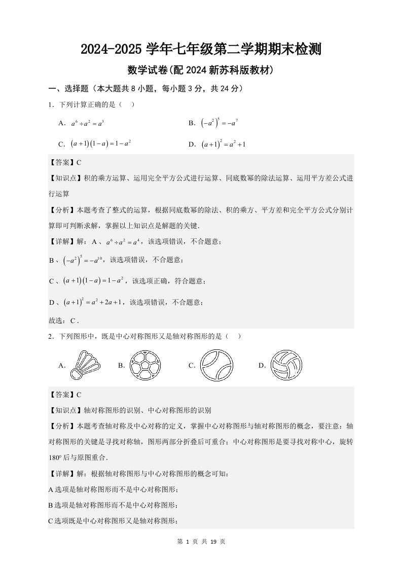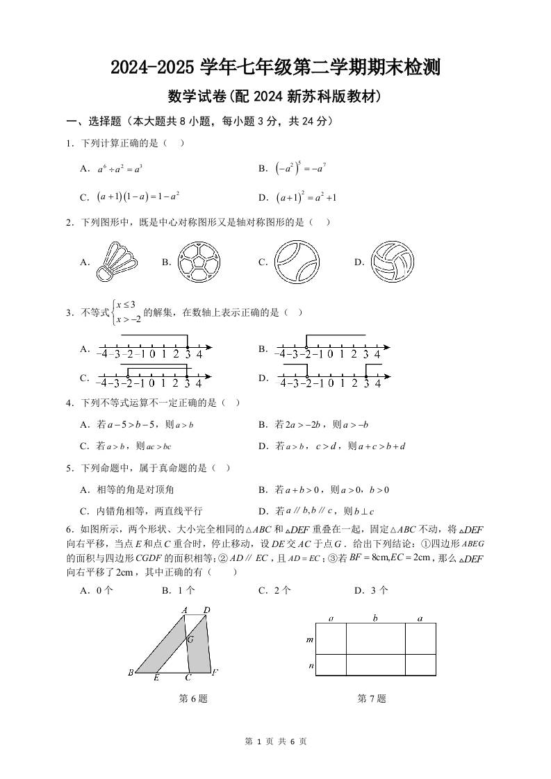 苏科版数学(2024)七年级下册期末真题试卷(含答案)