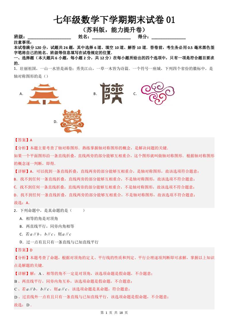 七年级数学下学期期末试卷01(苏科版,能力提升卷)(解析版)