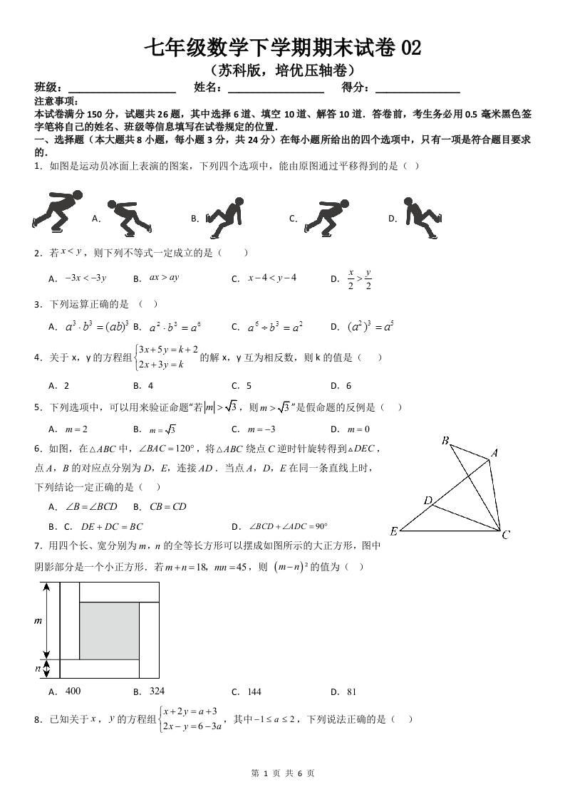七年级数学下学期期末试卷02(苏科版,培优压轴卷)(原卷版)