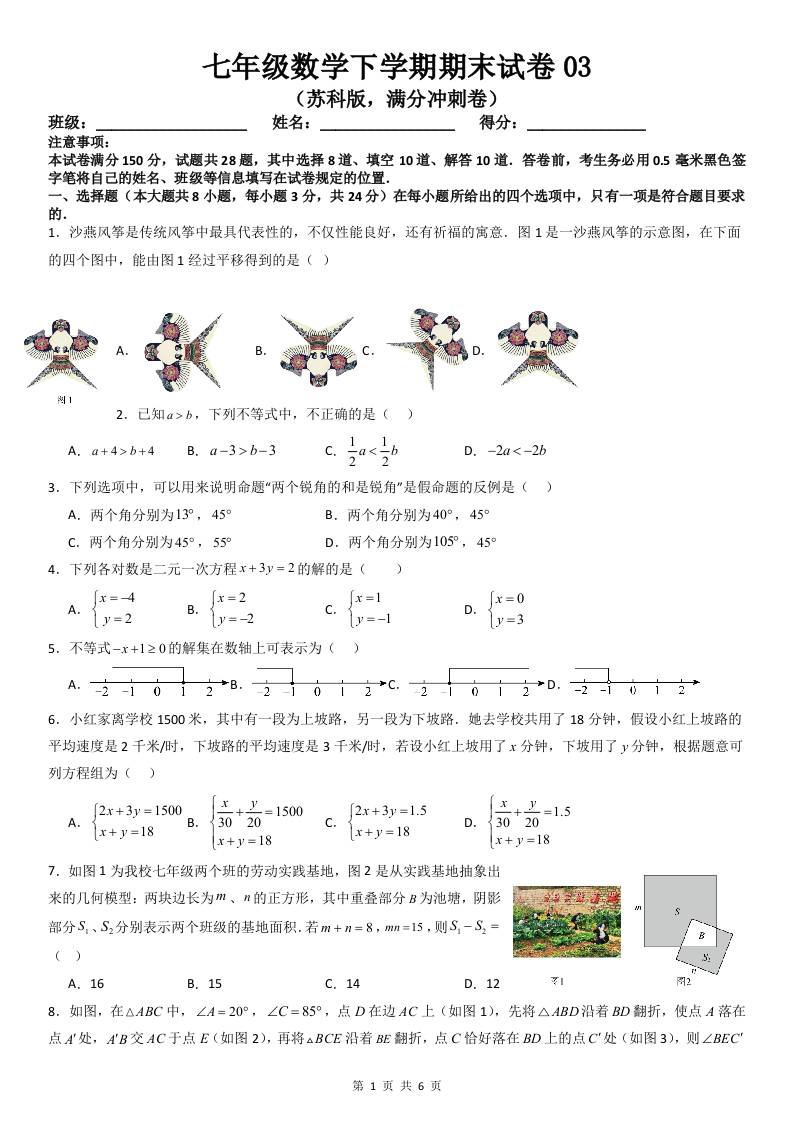 七年级数学下学期期末试卷03(苏科版,满分冲刺卷)(原卷版)