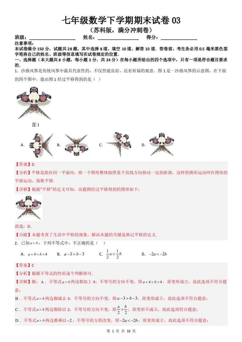 七年级数学下学期期末试卷03(苏科版,满分冲刺卷)(解析版)