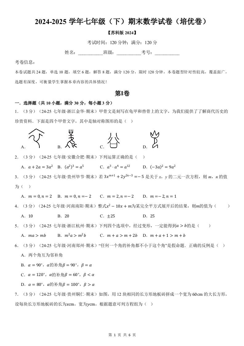 七年级(下)期末数学试卷(培优卷)(苏科版2024)(原卷版)