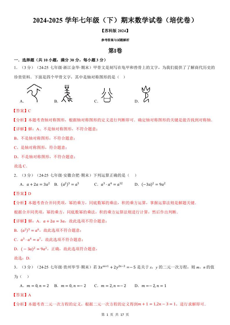 七年级(下)期末数学试卷(培优卷)(苏科版2024)(解析版)