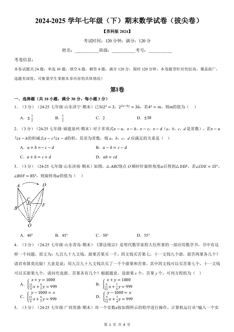 七年级(下)期末数学试卷(拔尖卷)(苏科版2024)(原卷版)
