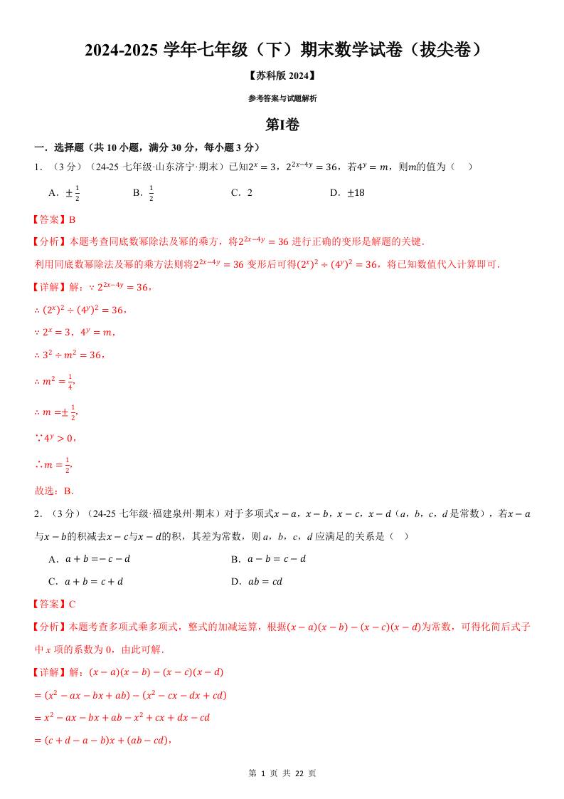 七年级(下)期末数学试卷(拔尖卷)(苏科版2024)(解析版)