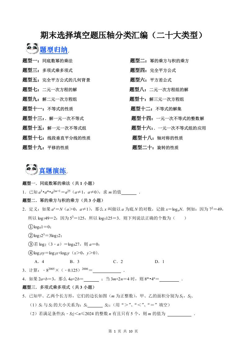 期末选择填空题压轴分类汇编(二十大类型)(原卷版)