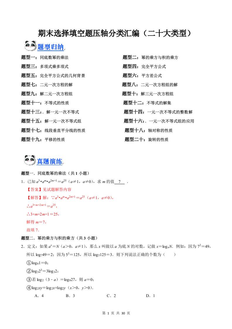 期末选择填空题压轴分类汇编(二十大类型)(解析版)