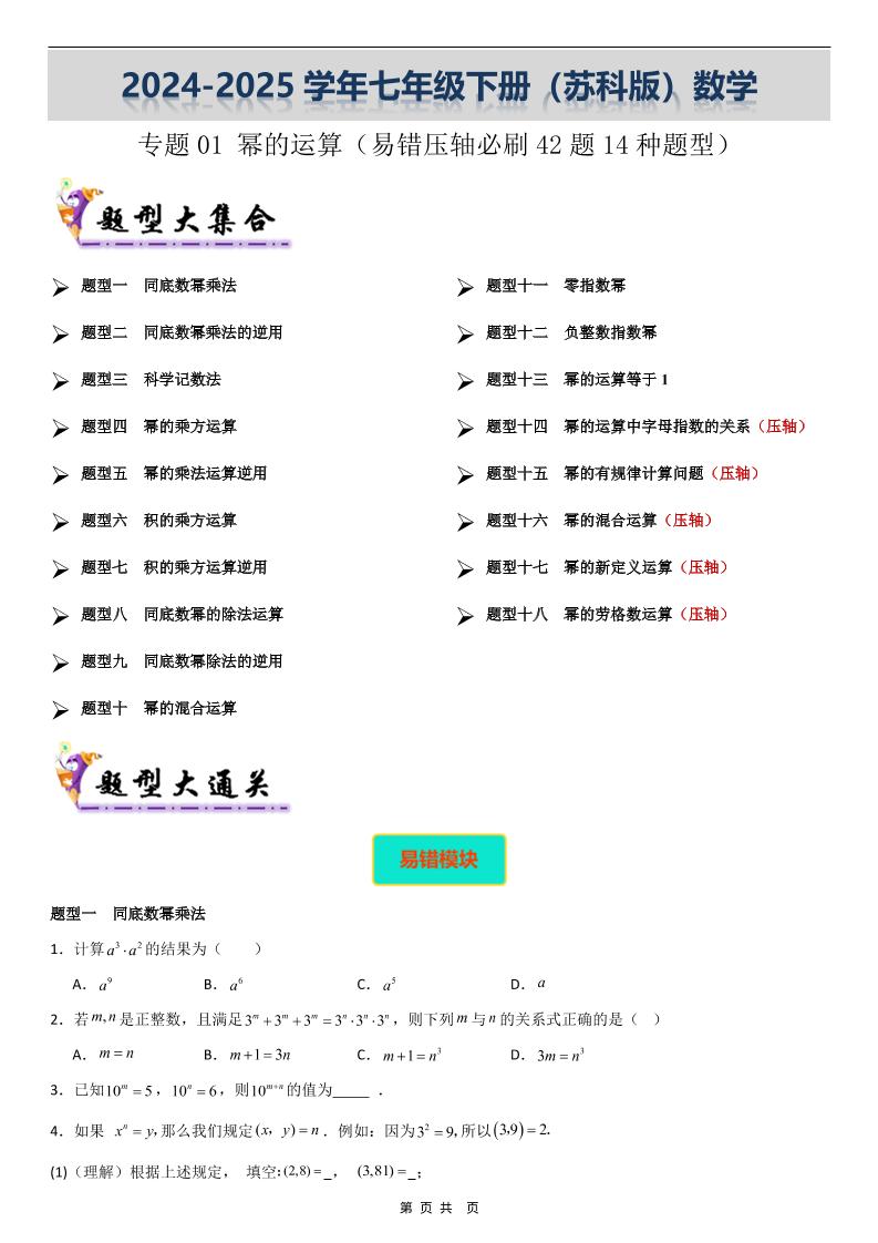 【七下苏科数学】专题01 幂的运算(考题猜想,易错压轴必刷72题18种题型)(原卷版)