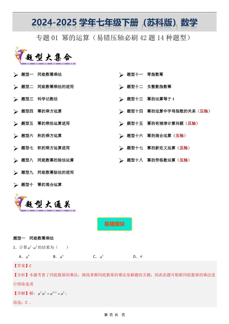 【七下苏科数学】专题01 幂的运算(考题猜想,易错压轴必刷72题18种题型)(解析版)