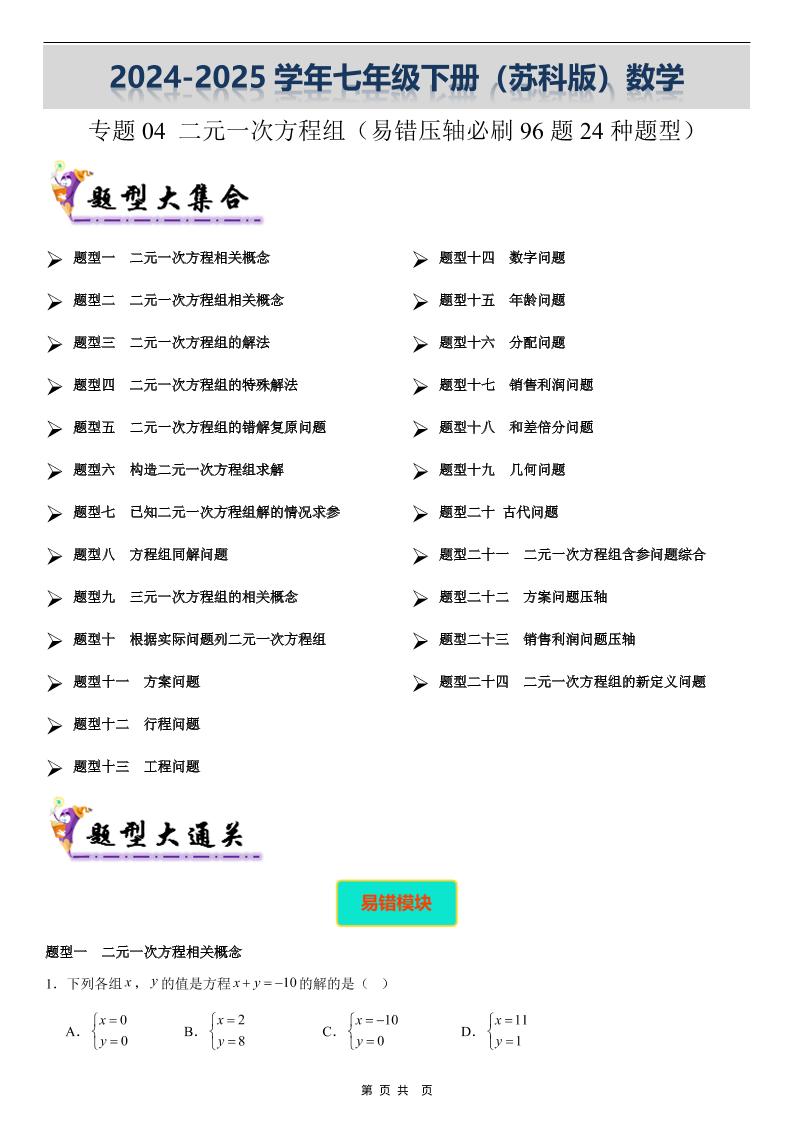 【七下苏科数学】专题04 二元一次方程组(考题猜想,易错压轴必刷96题24种题型)(原卷版)