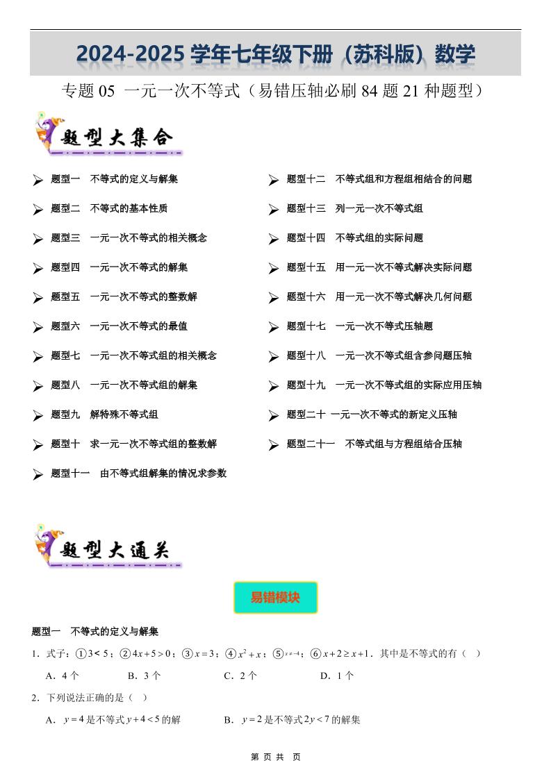 【七下苏科数学】专题05 一元一次不等式(考题猜想,易错压轴必刷84题21种题型)(原卷版)