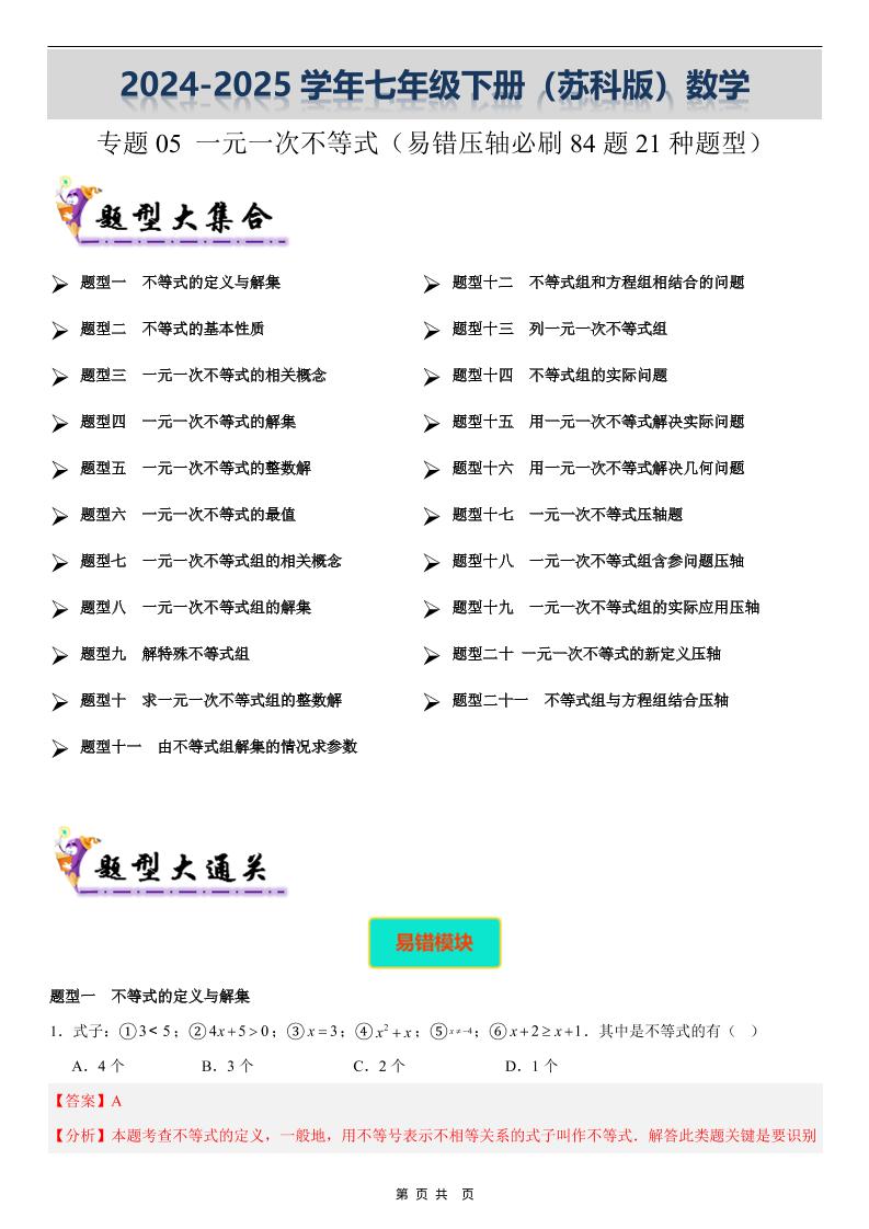 【七下苏科数学】专题05 一元一次不等式(考题猜想,易错压轴必刷84题21种题型)(解析版)