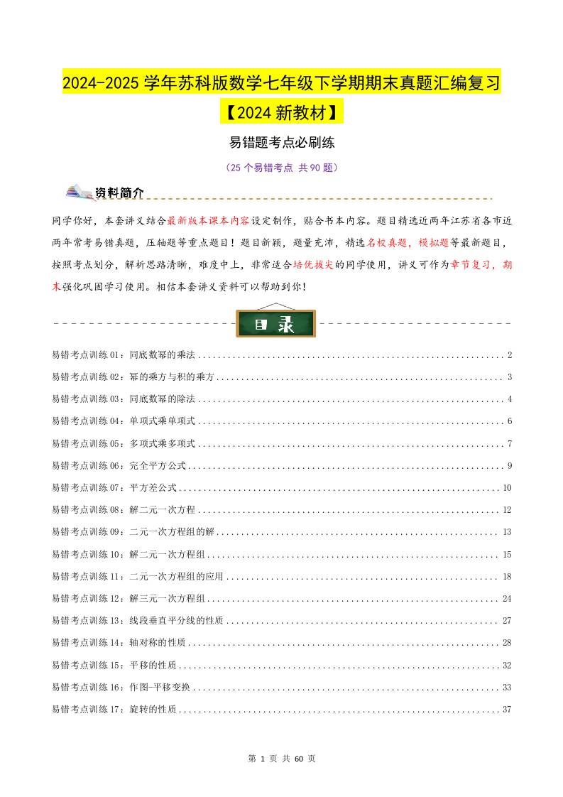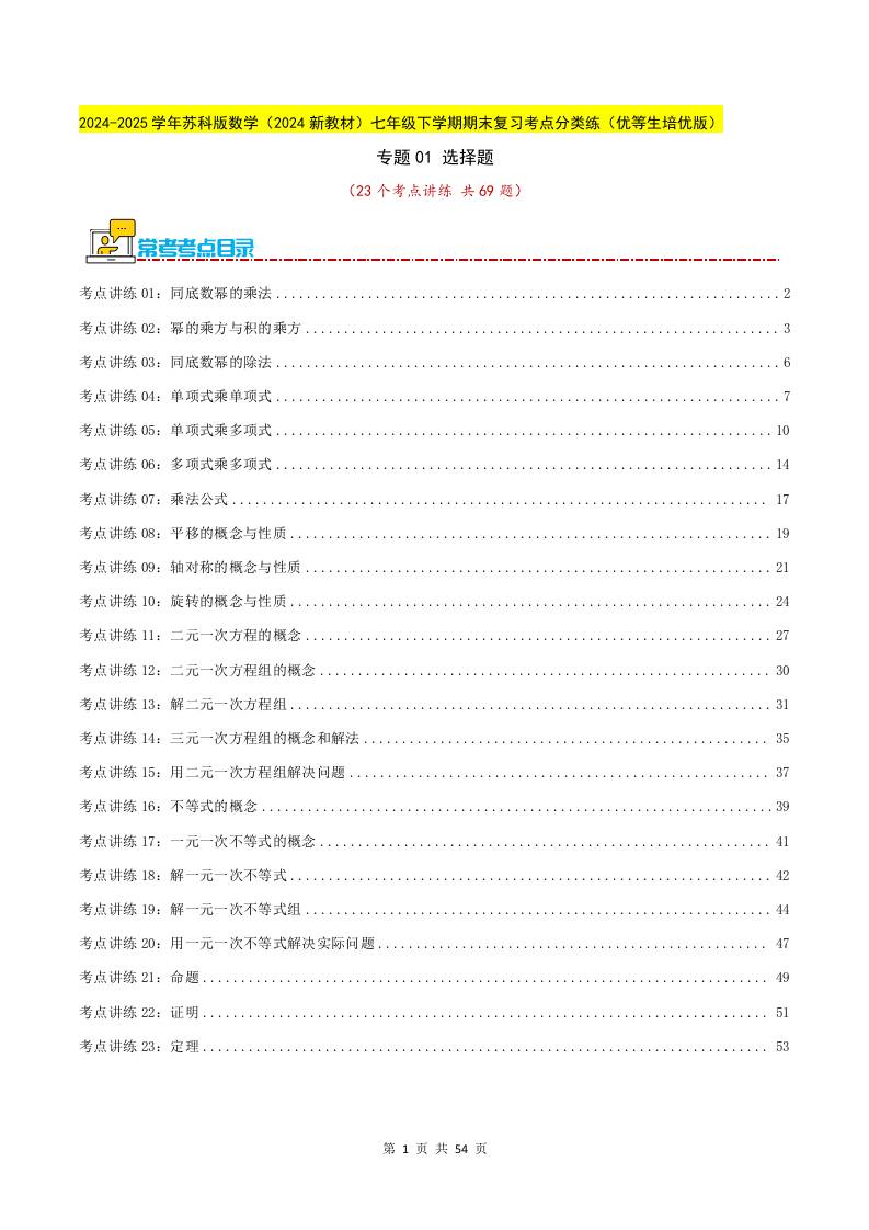 专题01 选择题(23个考点讲练 共69题)2024-2025学年苏科版数学七年级下学期期末复习考点分类练(优等生培优版)原卷版