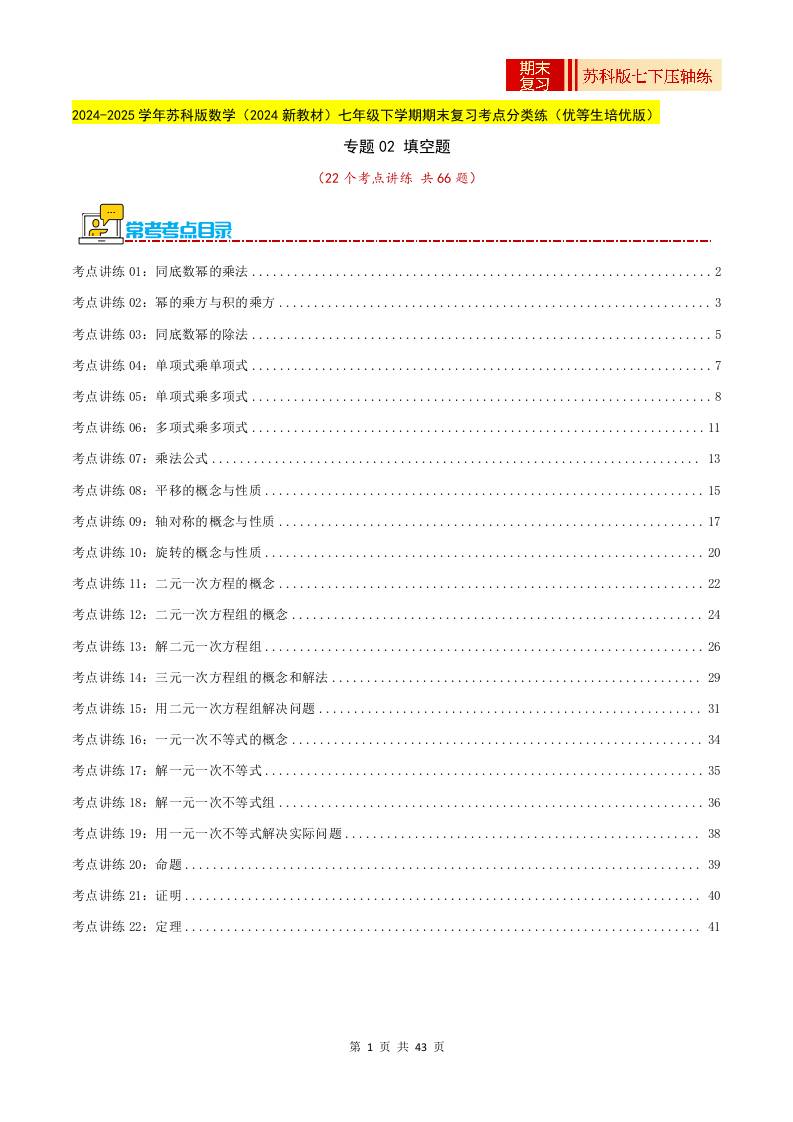专题02 填空题(22个考点讲练 共66题)2024-2025学年苏科版数学七年级下学期期末复习考点分类练(优等生培优版)原卷版