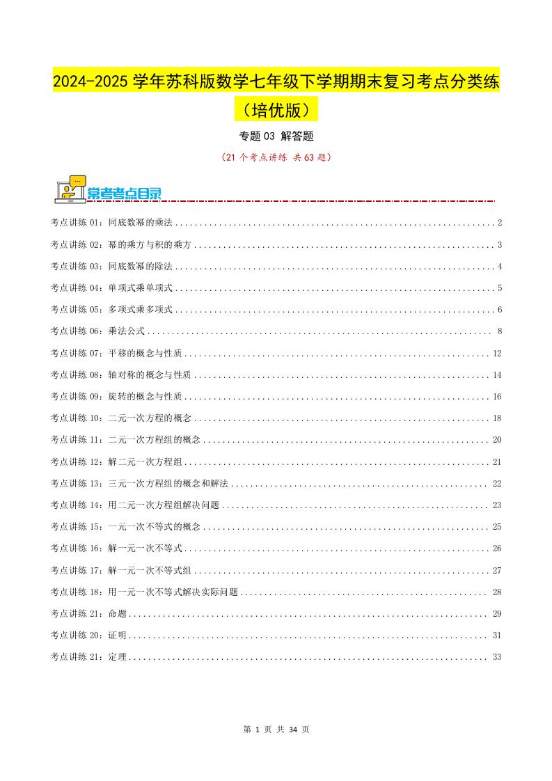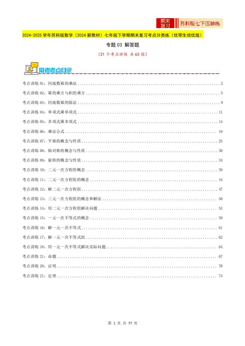 专题03 解答题(21个考点讲练 共63题)2024-2025学年苏科版数学七年级下学期期末复习考点分类练(优等生培优版)解析版