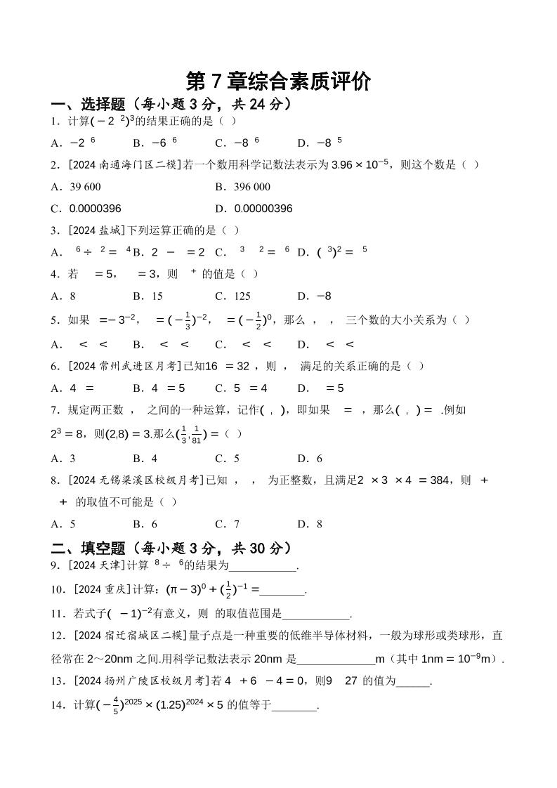 第7章 幂的运算 综合素质评价(含答案)2025学年苏科版七年级数学下册