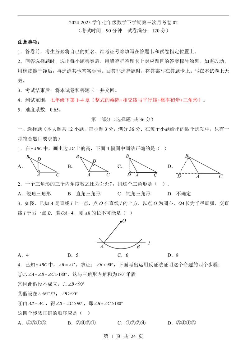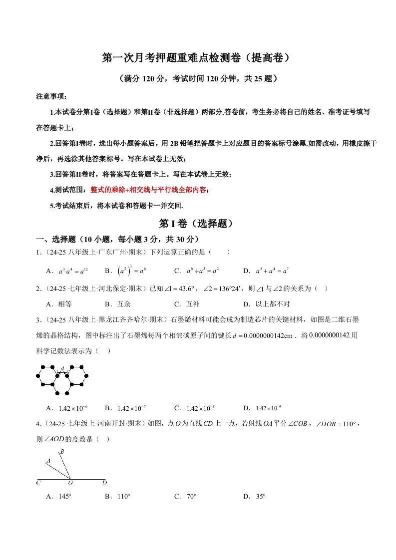 2024-2025学年第一次月考测试卷(基础卷)(考试版)【测试范围:整式的乘除~相交线与平行线】