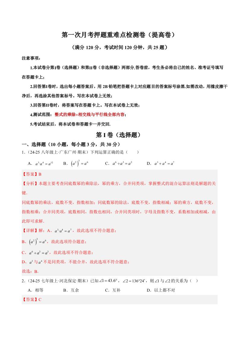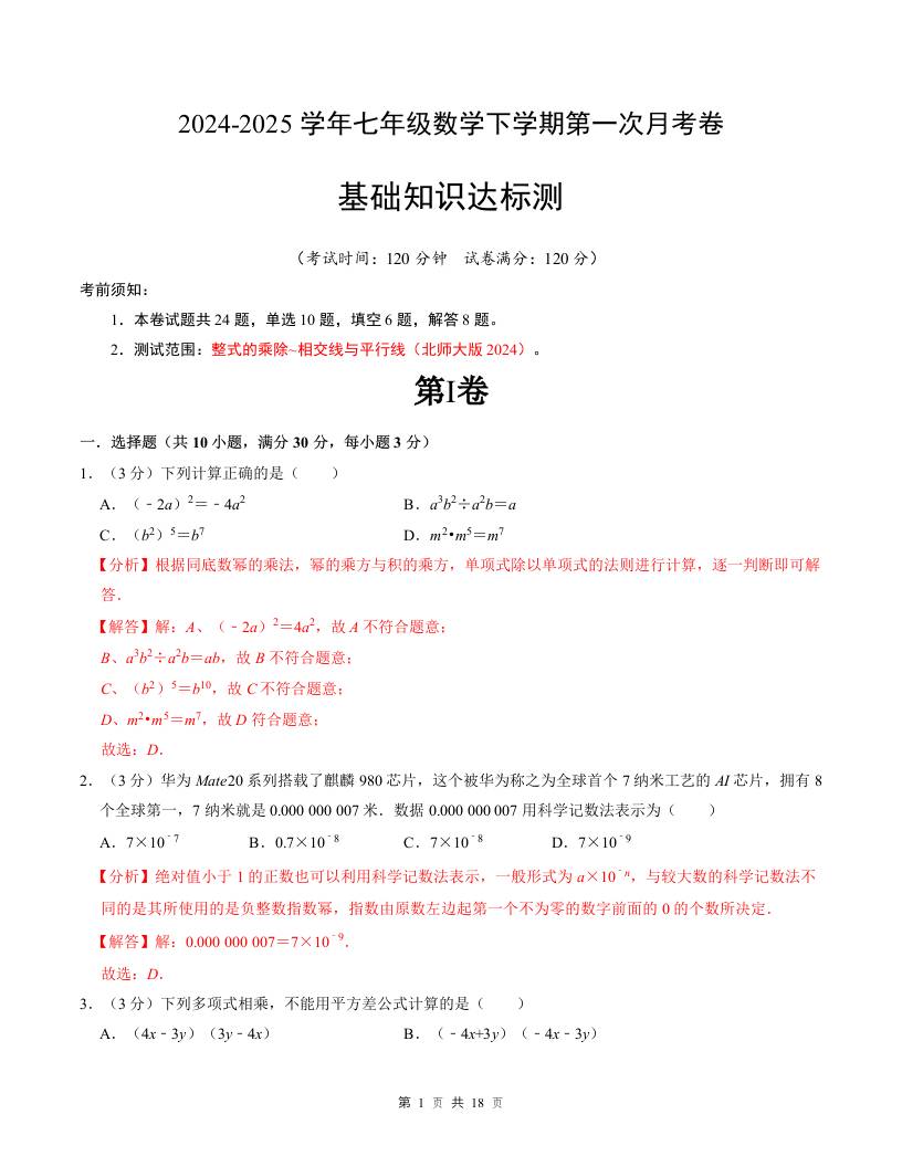 2024-2025学年第一次月考测试卷(基础卷)(解析版)【测试范围:整式的乘除~相交线与平行线】