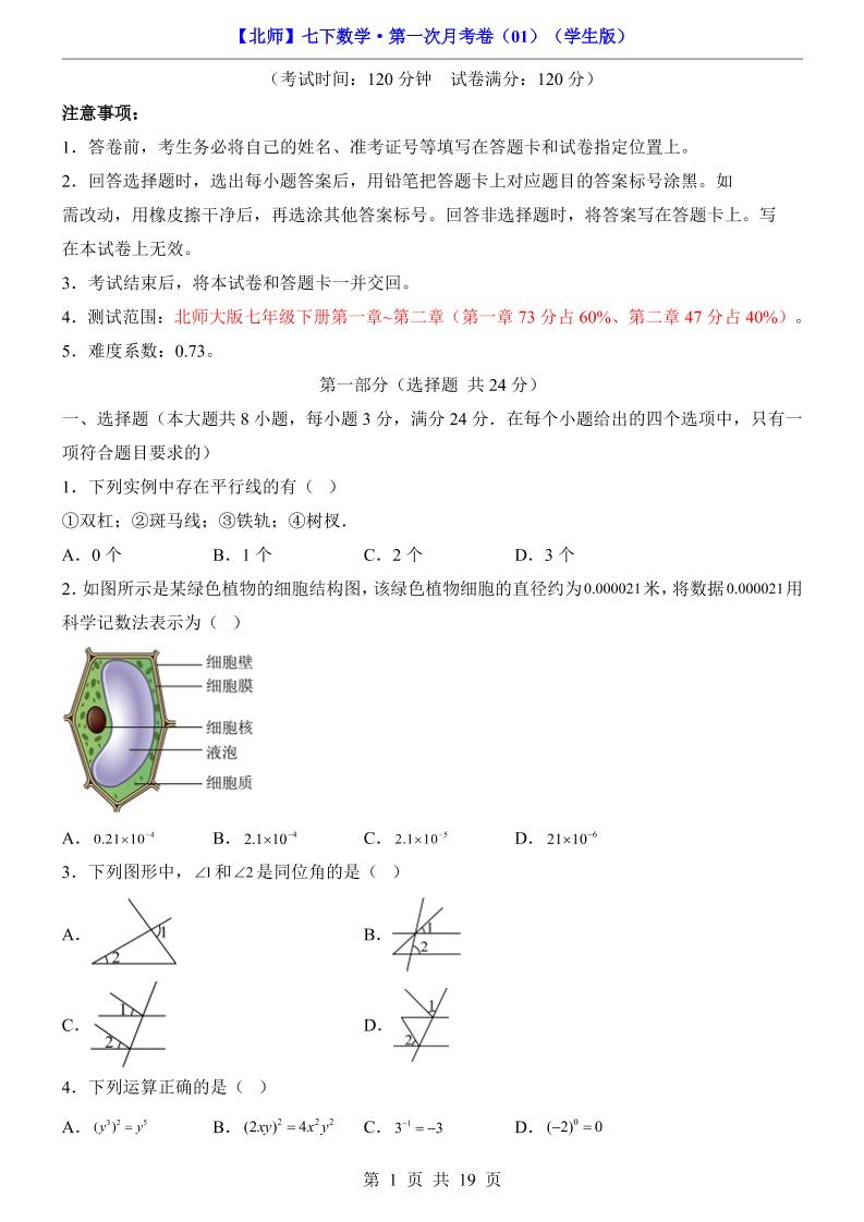 【北师】7下数学第1次月考01【第1-2章】