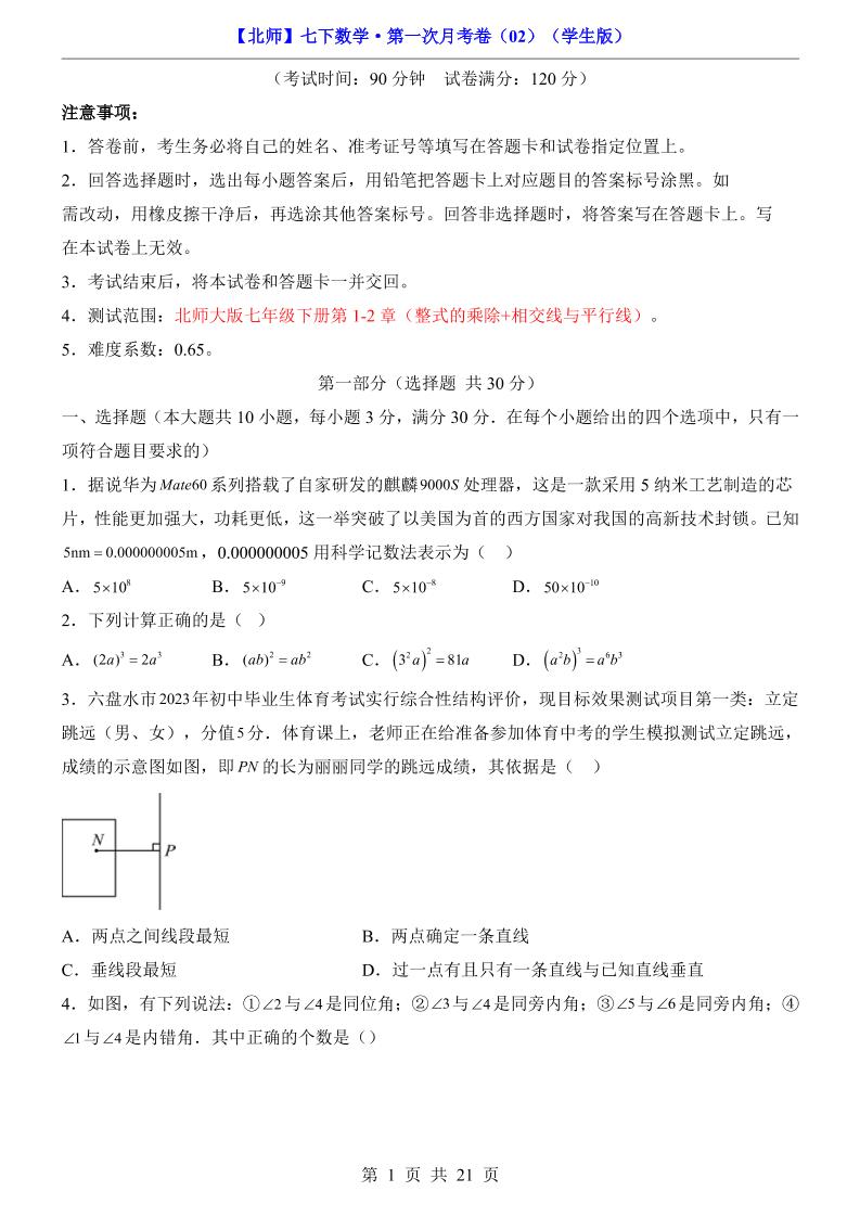 【北师】7下数学第1次月考02【第1-2章】