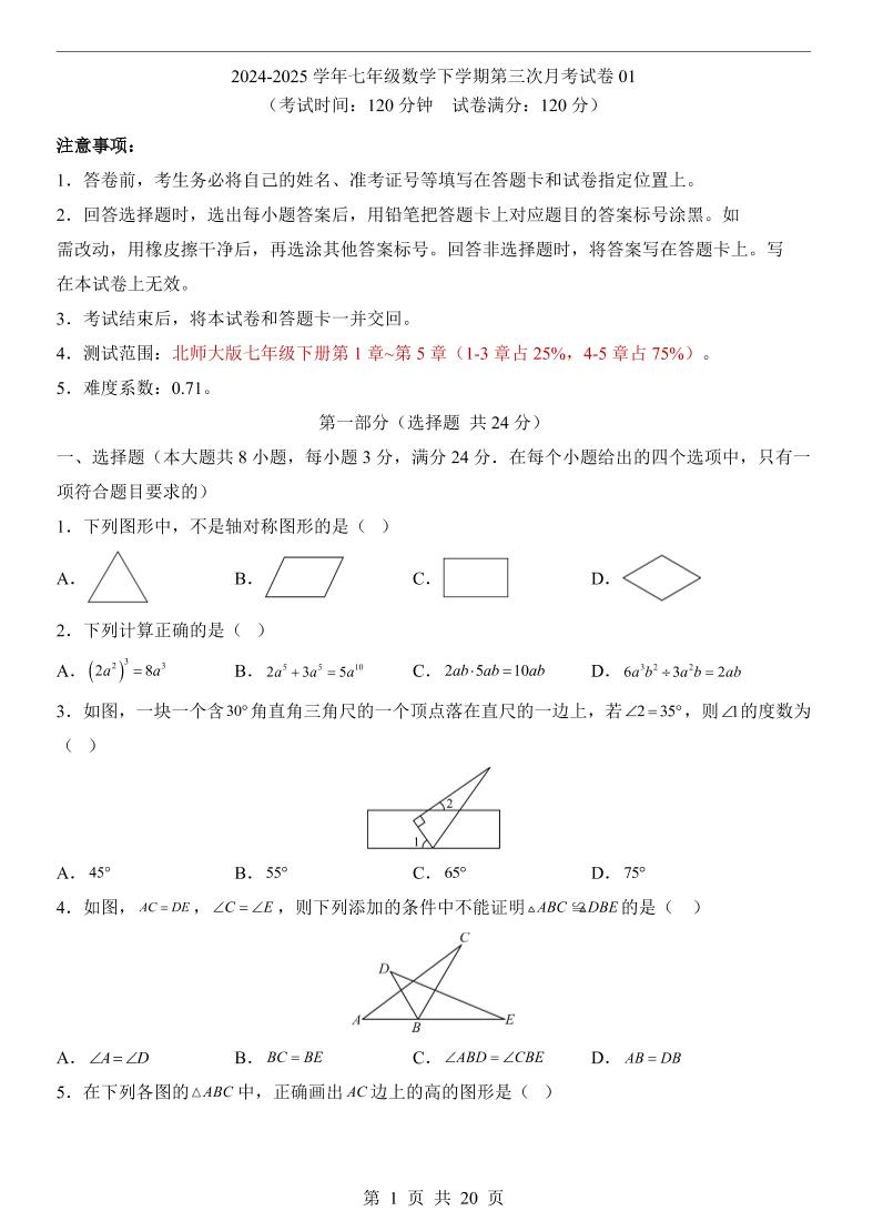 【北师】7下数学第3次月考01【第1-5章】
