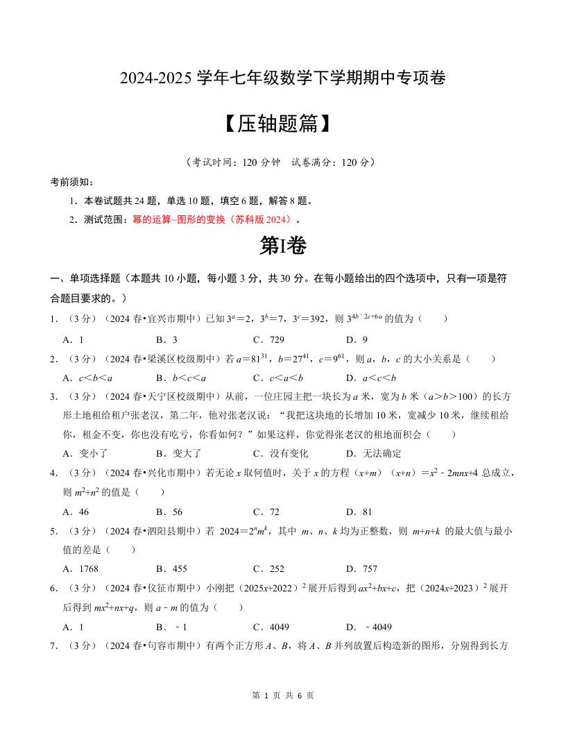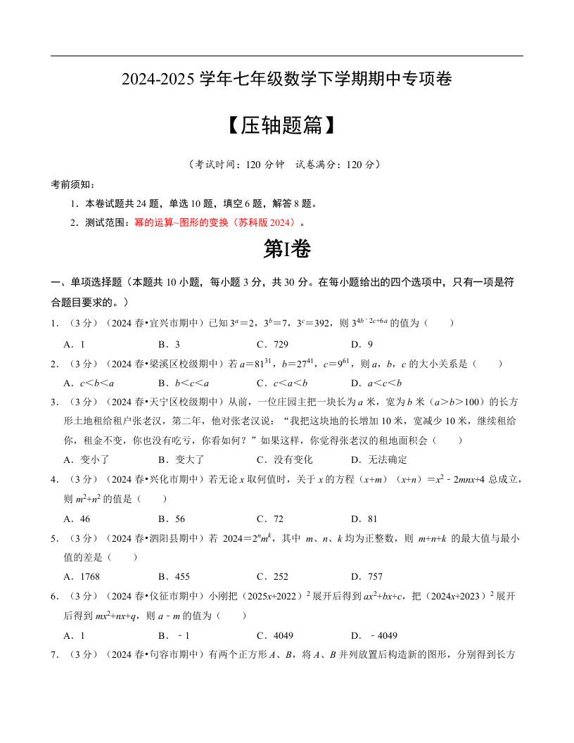 七年级数学下学期期中压轴题专项卷(苏科版2024)(考试版)【测试范围:幂的运算~图形的变换】