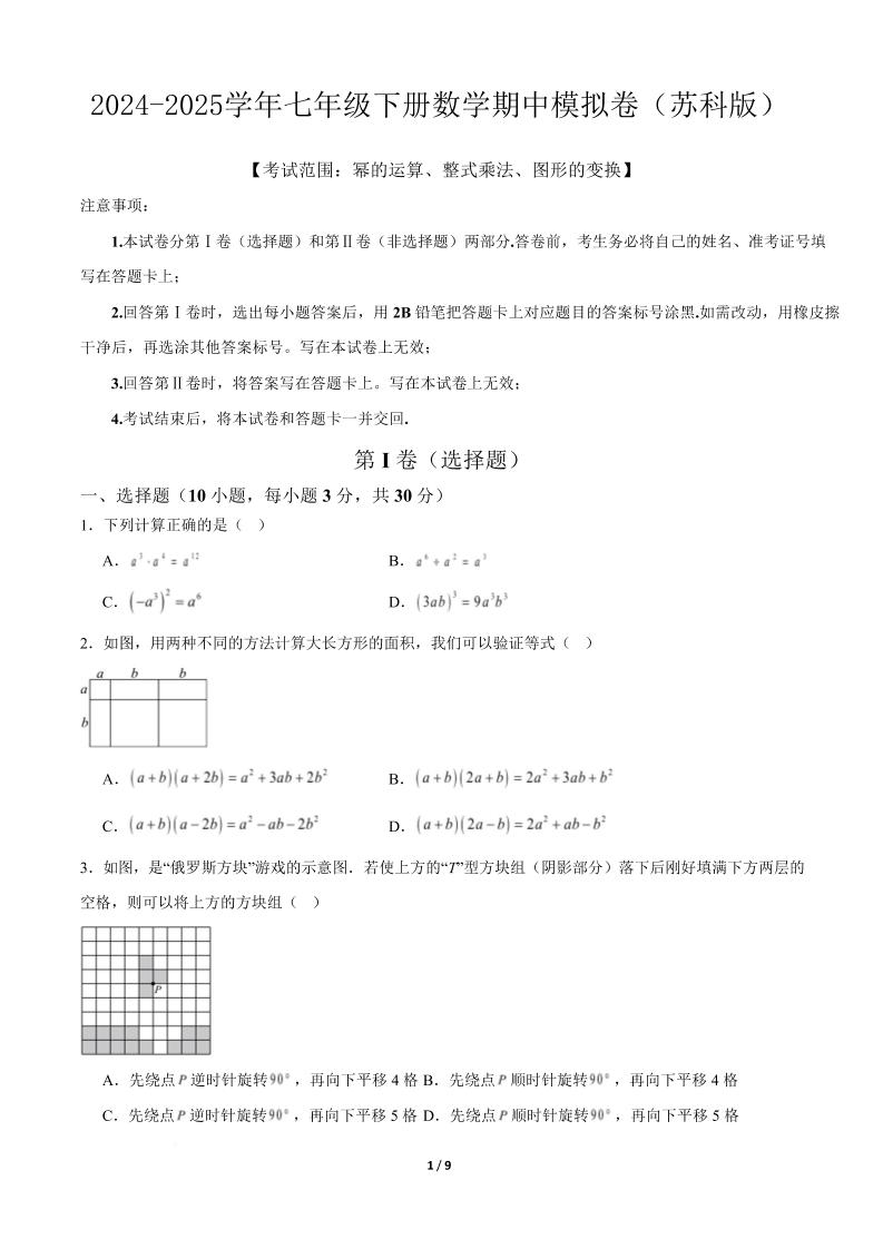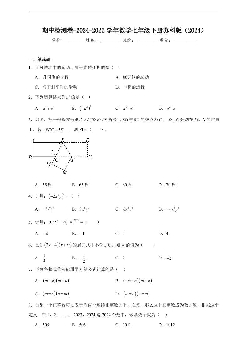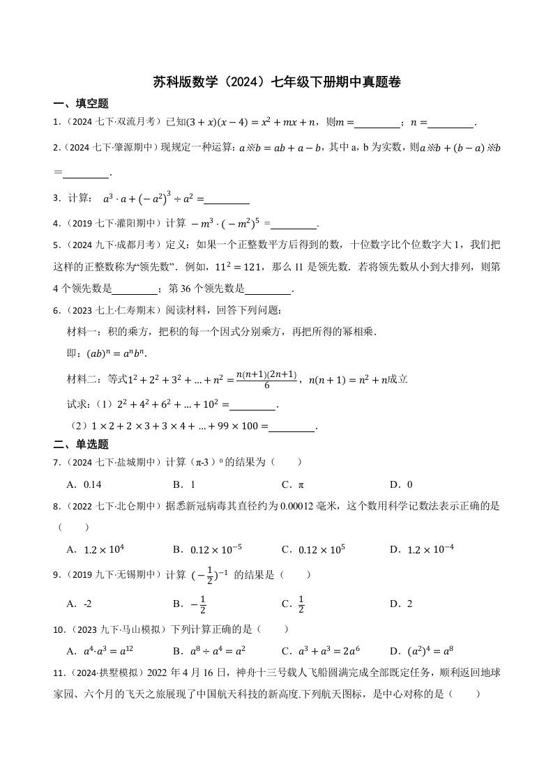 苏科版数学(2024)七年级下册期中真题卷(含答案)