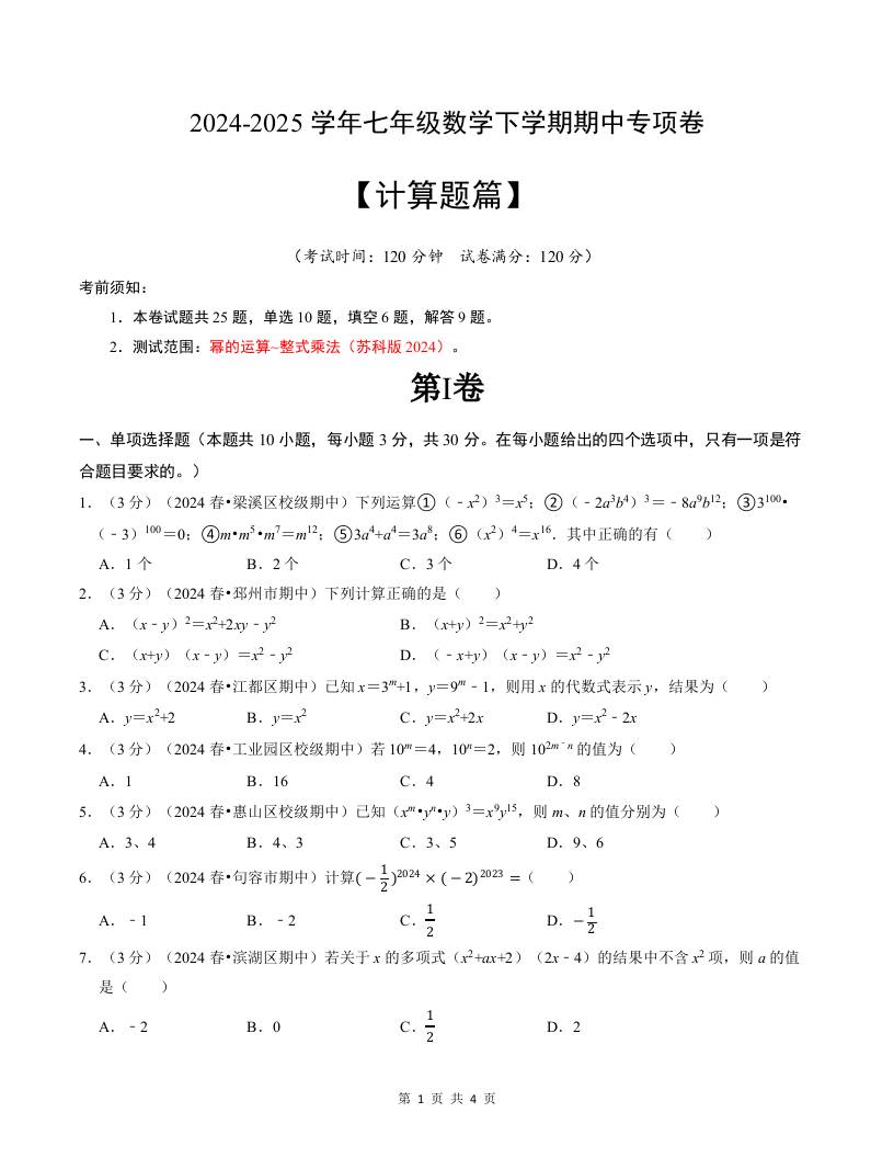 期中计算题专项卷(考试版)【测试范围:幂的运算~整式乘法】