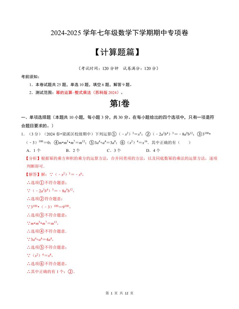 期中计算题专项卷(解析版)【测试范围:幂的运算~整式乘法】