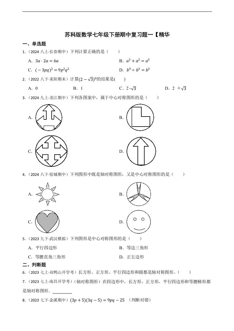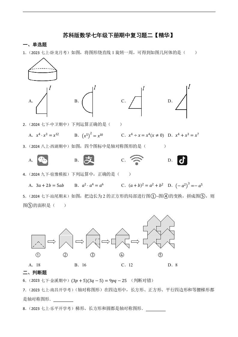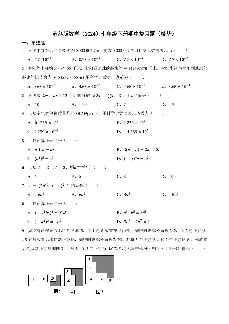 苏科版数学(2024)七年级下册期中复习题(精华)(含答案)