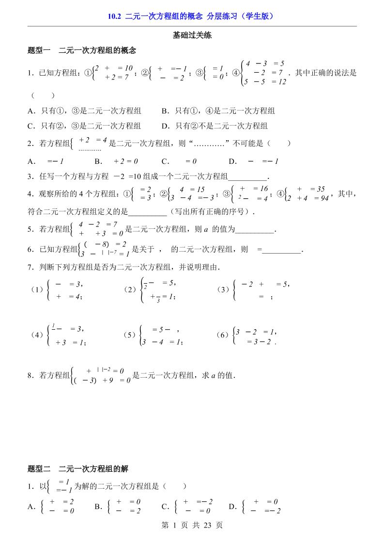 10.2 二元一次方程组的概念(分层练习)