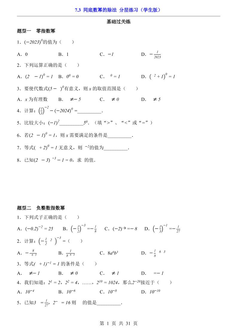 7.3 同底数幂的除法(分层练习)